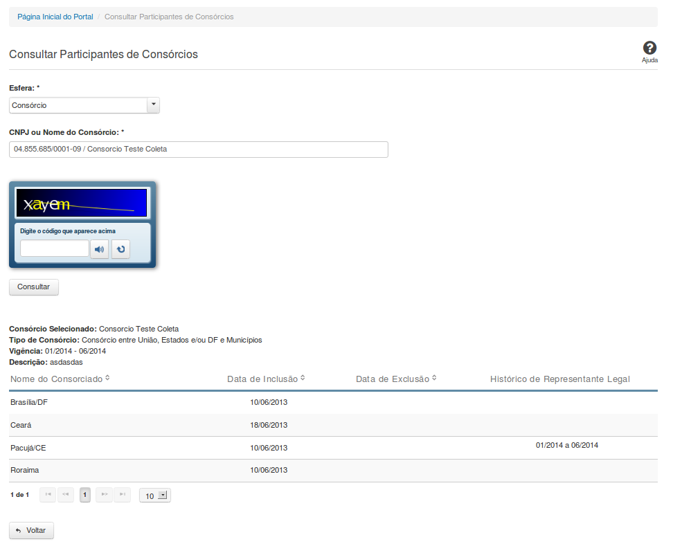 Essa tela permite que você obtenha uma lista de consórcios dos quais um determinado ente participa, bem como quais entes participam de um determinado consórcio.