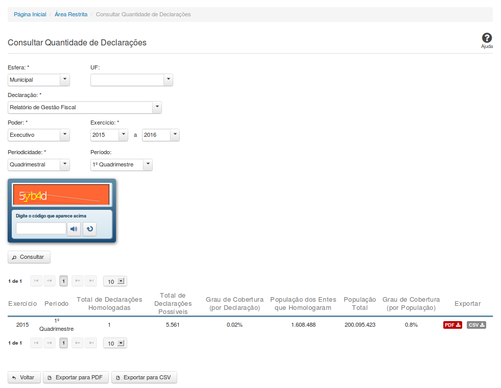 Essa tela permite que você obtenha a quantidade de declarações homologadas/retificadas no sistema SICONFI, por período.