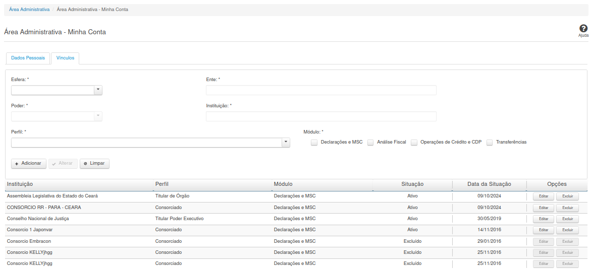 Serão exibidos todos os vínculos já cadastrados para o usuário e apresentados os seguintes campos: