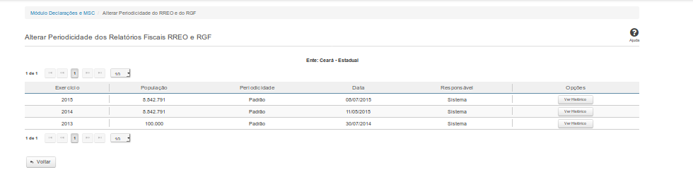 Essa tela permite que você visualize as periodicidades dos relatórios RREO e RGF para o ente ao qual você pertence, podendo também alterá-las.