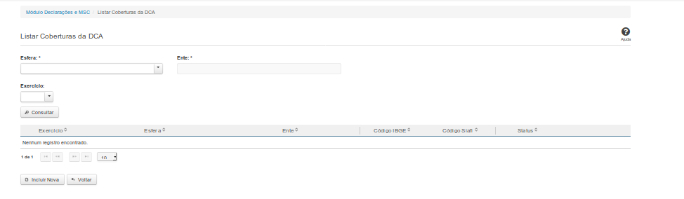 Essa tela permite que você obtenha uma lista de coberturas de uma DCA. A cobertura é composta pelos órgãos e entidades que foram consolidados na DCA.