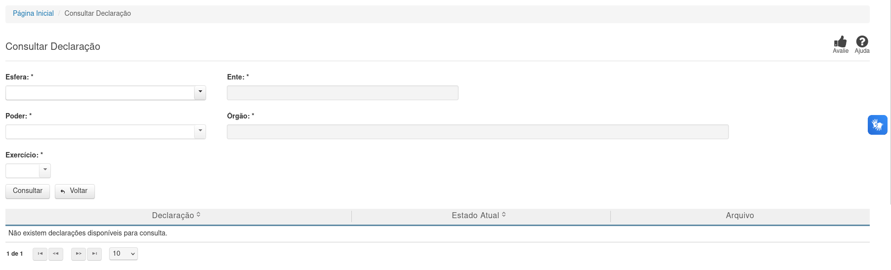 Essa tela permite que você obtenha uma lista de declarações cadastradas no sistema SICONFI.