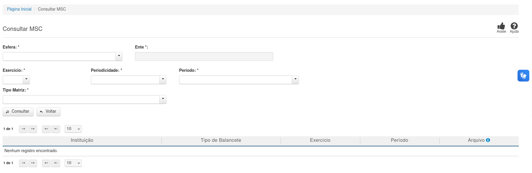 Essa tela permite que você obtenha uma lista de Matrizes de Saldos Contábeis cadastradas no sistema Siconfi.