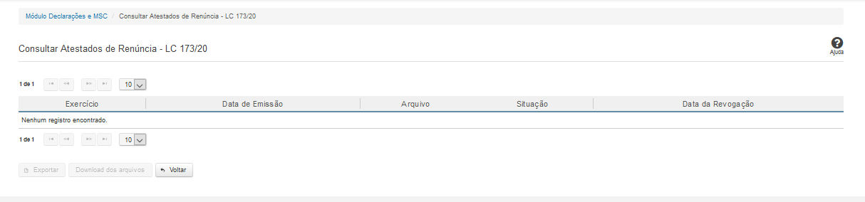 Esta tela permite que você visualize a lista de atestados de renúncia de ações - auxílio LC 173/20 referente ao ente ao qual você pertence.
