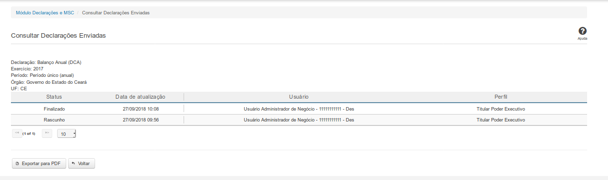 Status - status da declaração.
