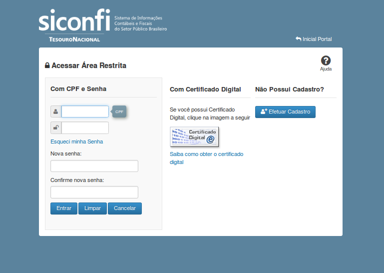 Entrar - Clique nesse botão após fornecer seus dados para ter acesso à área restrita do sistema SICONFI. Na próxima tela você poderá selecionar a funcionalidade desejada, entre as diversas opções disponíveis para você.
