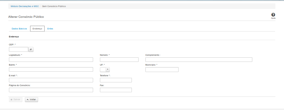Essa tela permite que você inclua ou altere o endereço de um consórcio público.
